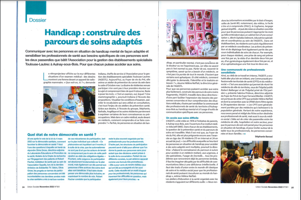 Dans le cadre de la collaboration avec l’UNIOPPS et suite au reportage effectué au Foyer du Pré, un article est paru dans la revue Union Sociale n° 361 de novembre 2022