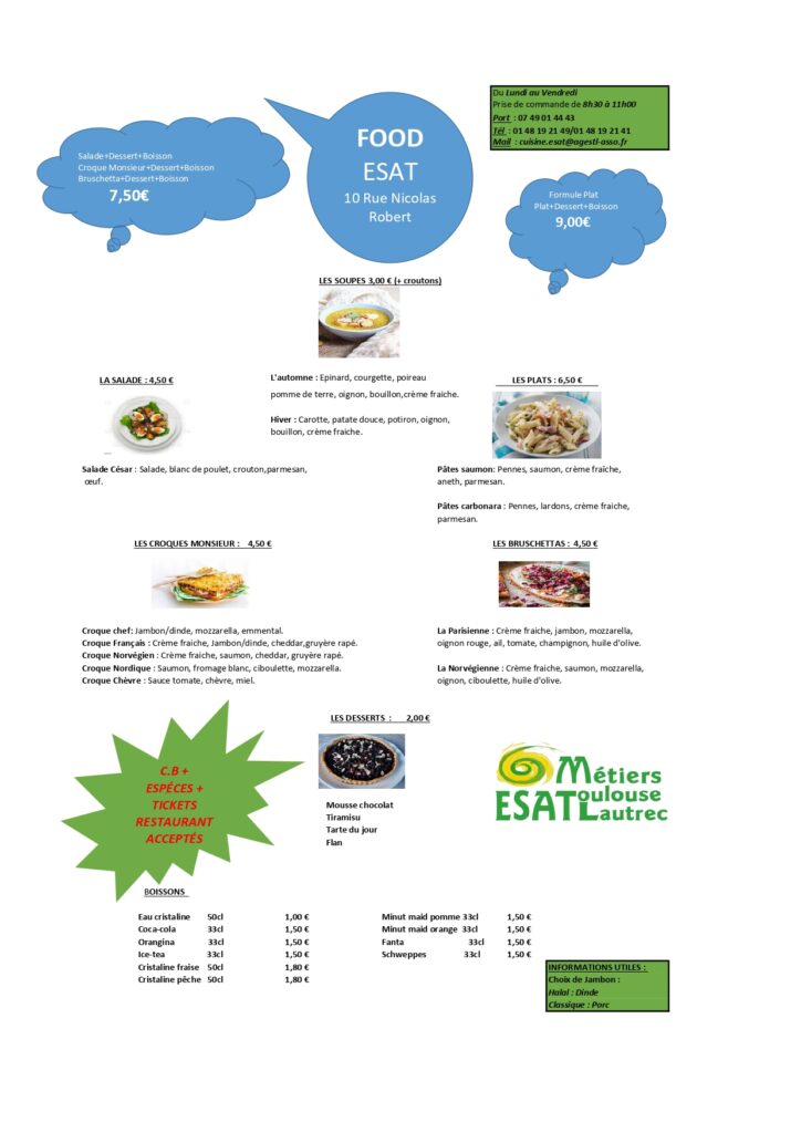 - Les produits vendus sont confectionnés par les usagers et leurs encadrants à partir de produits frais garantissant chaque jour un service de qualité et des plats faits maison à la hauteur des exigences des clients et des habitués.